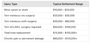 As to knee injuries, you’ll likely see a settlement amount above the average when surgery is required to repair the injury. When surgery is required for a torn anterior cruciate ligament (ACL), the value of a workers’ compensation settlement can rise to $80,000 or higher.